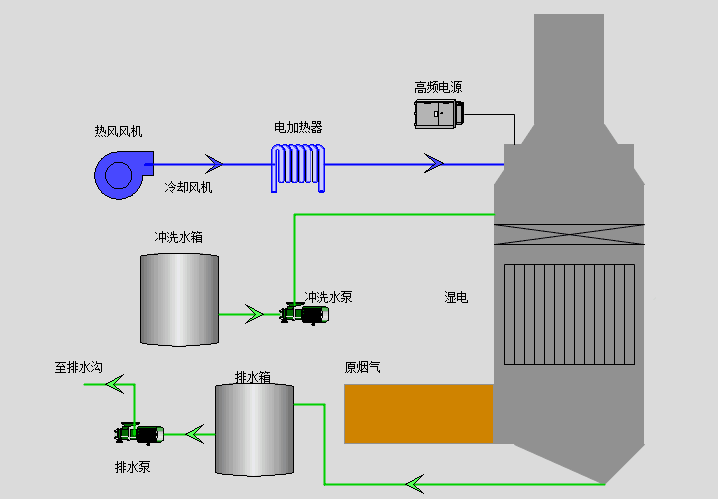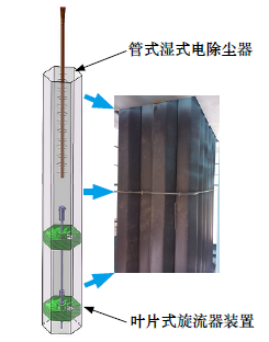 濕式電除塵裝置采用上下兩部分區(qū)域組成,裝置的底部煙氣入口由葉片式旋流器組成,葉片旋流板放置在電極管中,可以設(shè)置一層或者多層葉片旋流板,上部由管式電除塵器組成。