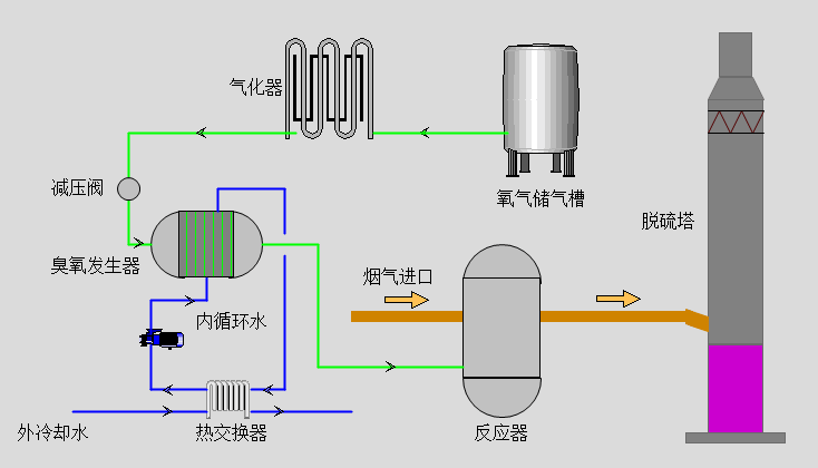 氧化反應(yīng)主要是利用臭氧的強(qiáng)氧化性,將不可溶的低價(jià)態(tài)氮氧化物氧化為可溶的高價(jià)態(tài)氮氧化物,然后在洗滌塔內(nèi)將氮氧化物吸收,達(dá)到脫除的目的。同時(shí)不影響其它污染物控制技術(shù),是傳統(tǒng)脫硝技術(shù)的一個(gè)高效補(bǔ)充或替代技術(shù)。