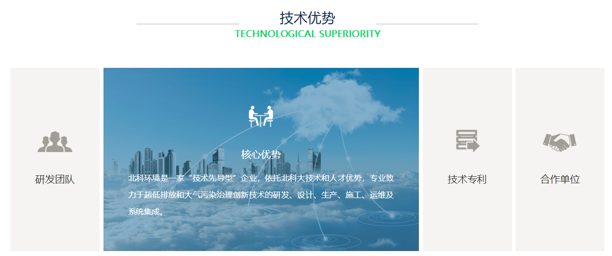 點(diǎn)擊“首頁”,企業(yè)愿景與企業(yè)背景映入眼簾,主營業(yè)務(wù)、主導(dǎo)技術(shù)、技術(shù)優(yōu)勢(shì)、資訊中心、經(jīng)典案例精要提煉。首頁內(nèi)容策劃別出心裁,讓您簡(jiǎn)明快速地了解北科環(huán)境。