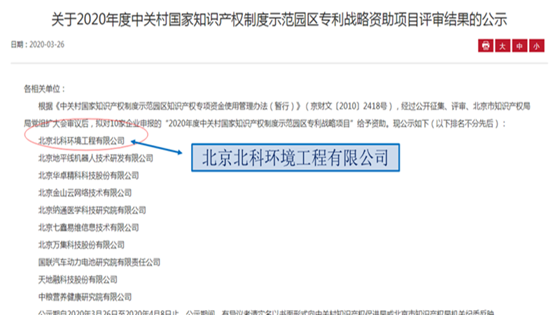 2020年326日,中關(guān)村知識(shí)產(chǎn)權(quán)促進(jìn)局對(duì)“2020年度中關(guān)村國(guó)家知識(shí)產(chǎn)權(quán)制度示范園區(qū)專利戰(zhàn)略資助項(xiàng)目”的評(píng)審結(jié)果進(jìn)行了公示,北京北科環(huán)境工程有限公司(以下簡(jiǎn)稱:北科環(huán)境)位列榜首。